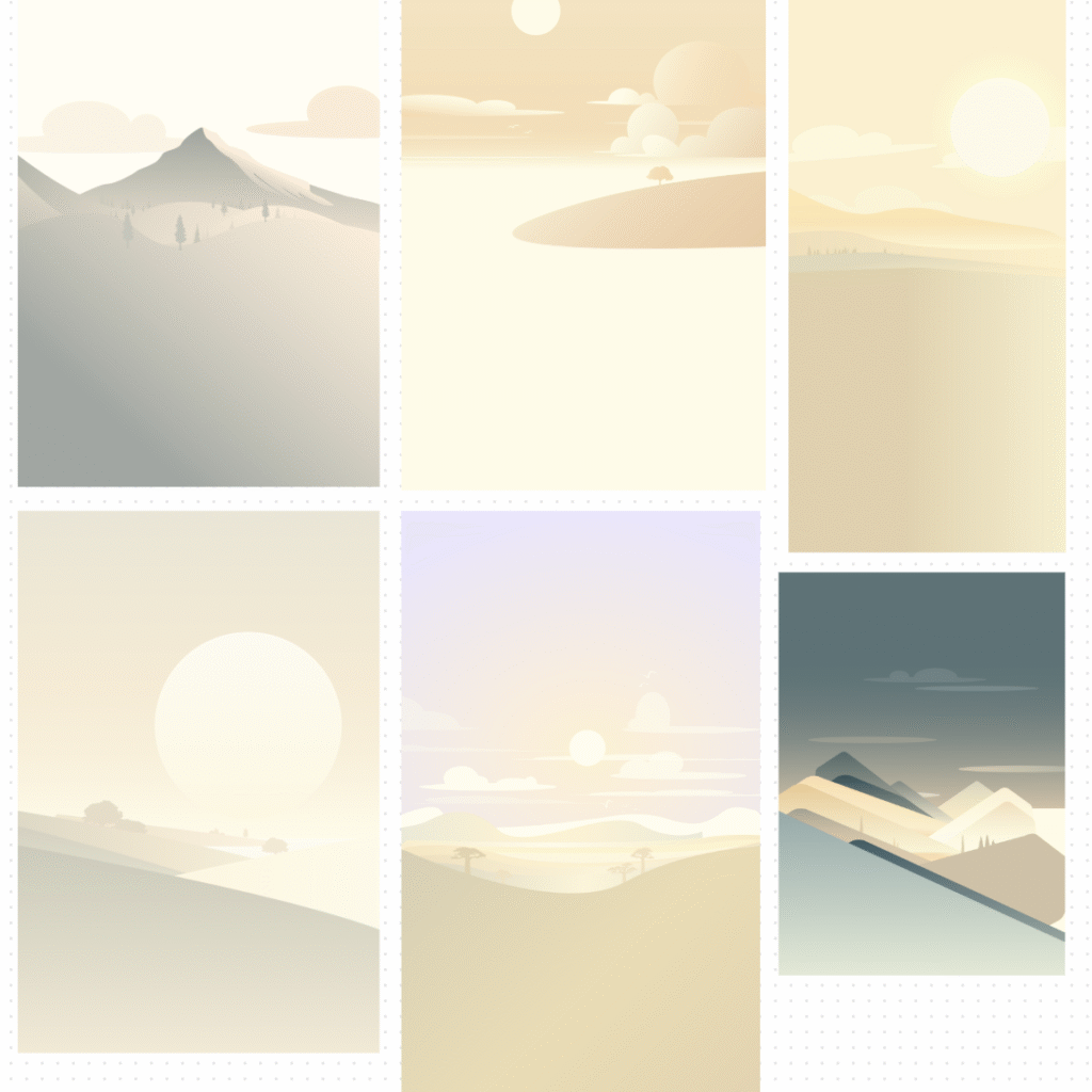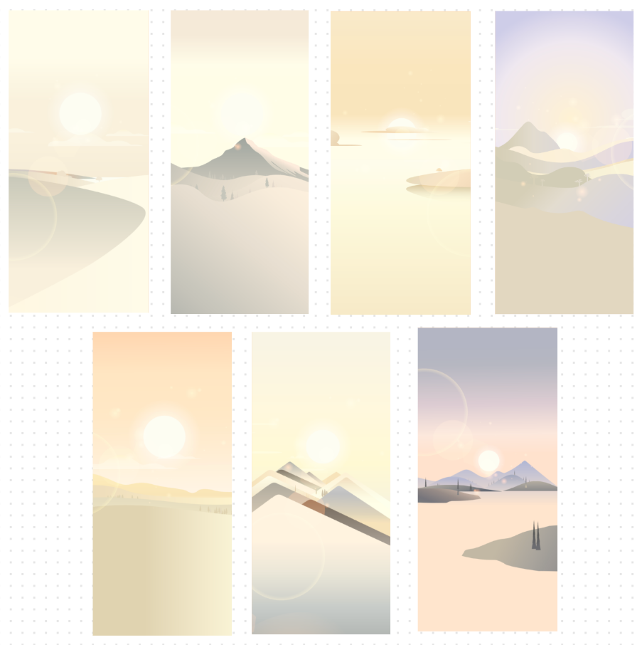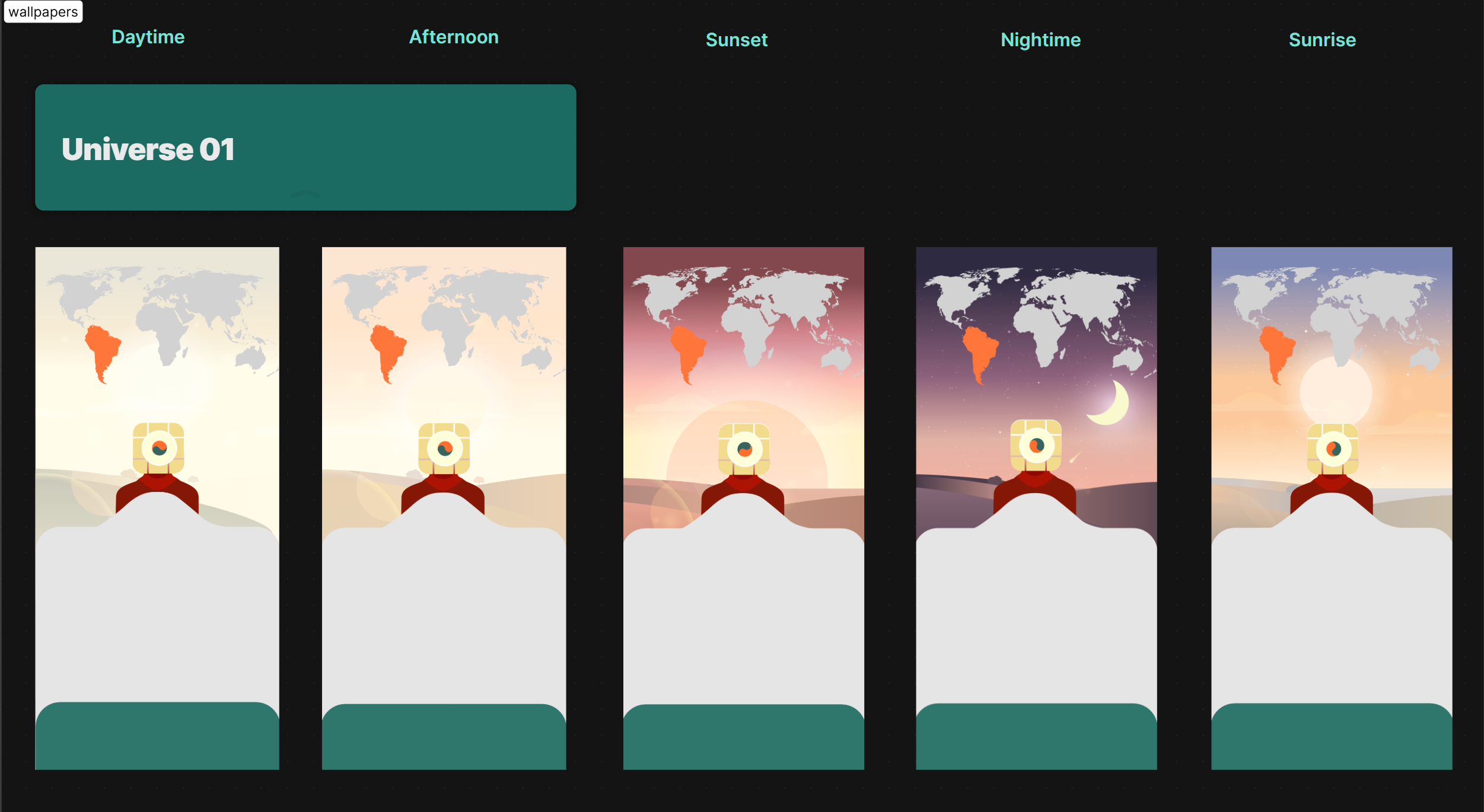 Then, in the Illustrator file, she developed time-based variations for each universe to create a full day–night cycle. Open the app in the morning and you’ll see a sunny landscape. Then get back in the evening and you’ll see a glowing sunset or a starry night.