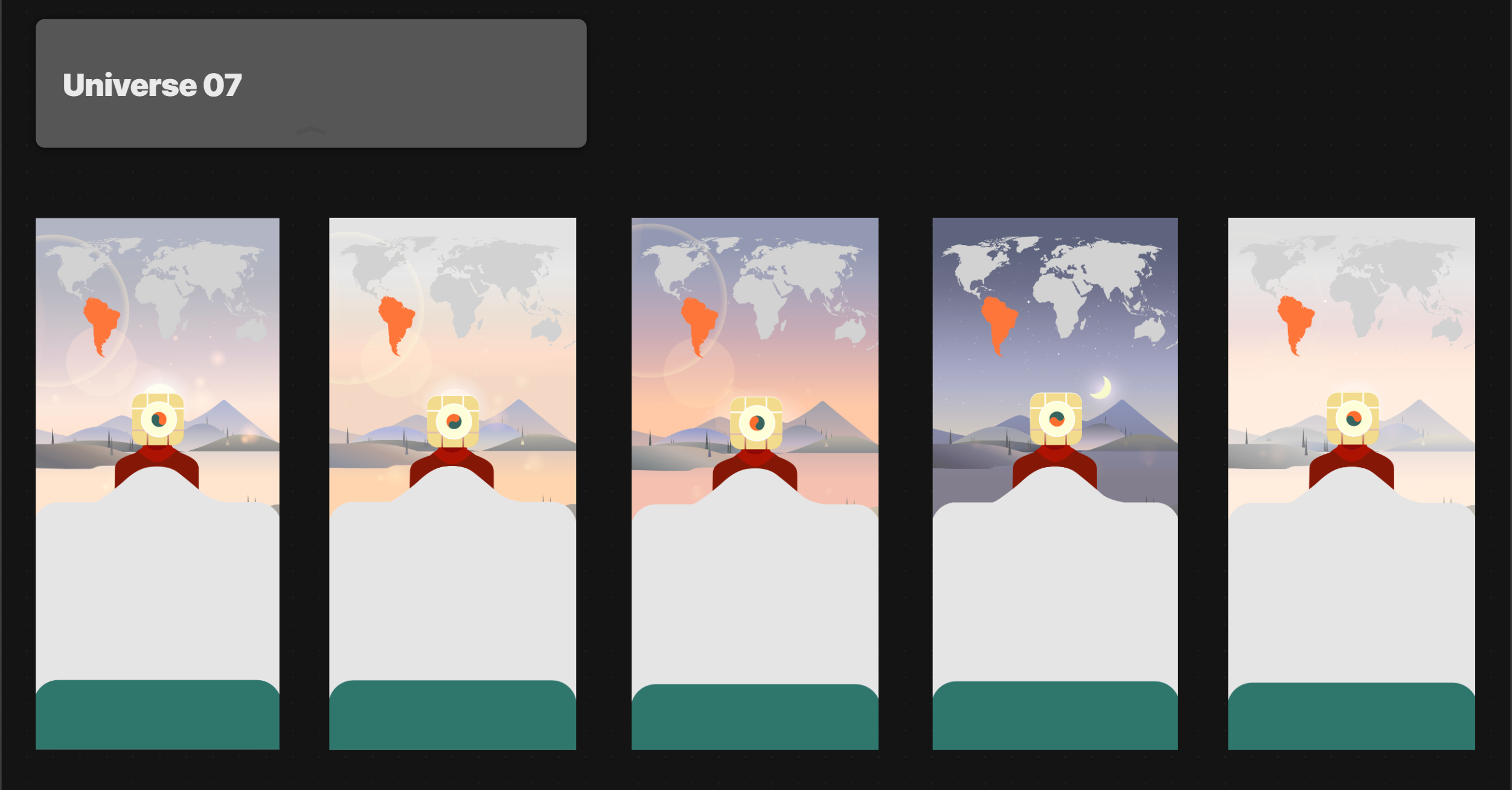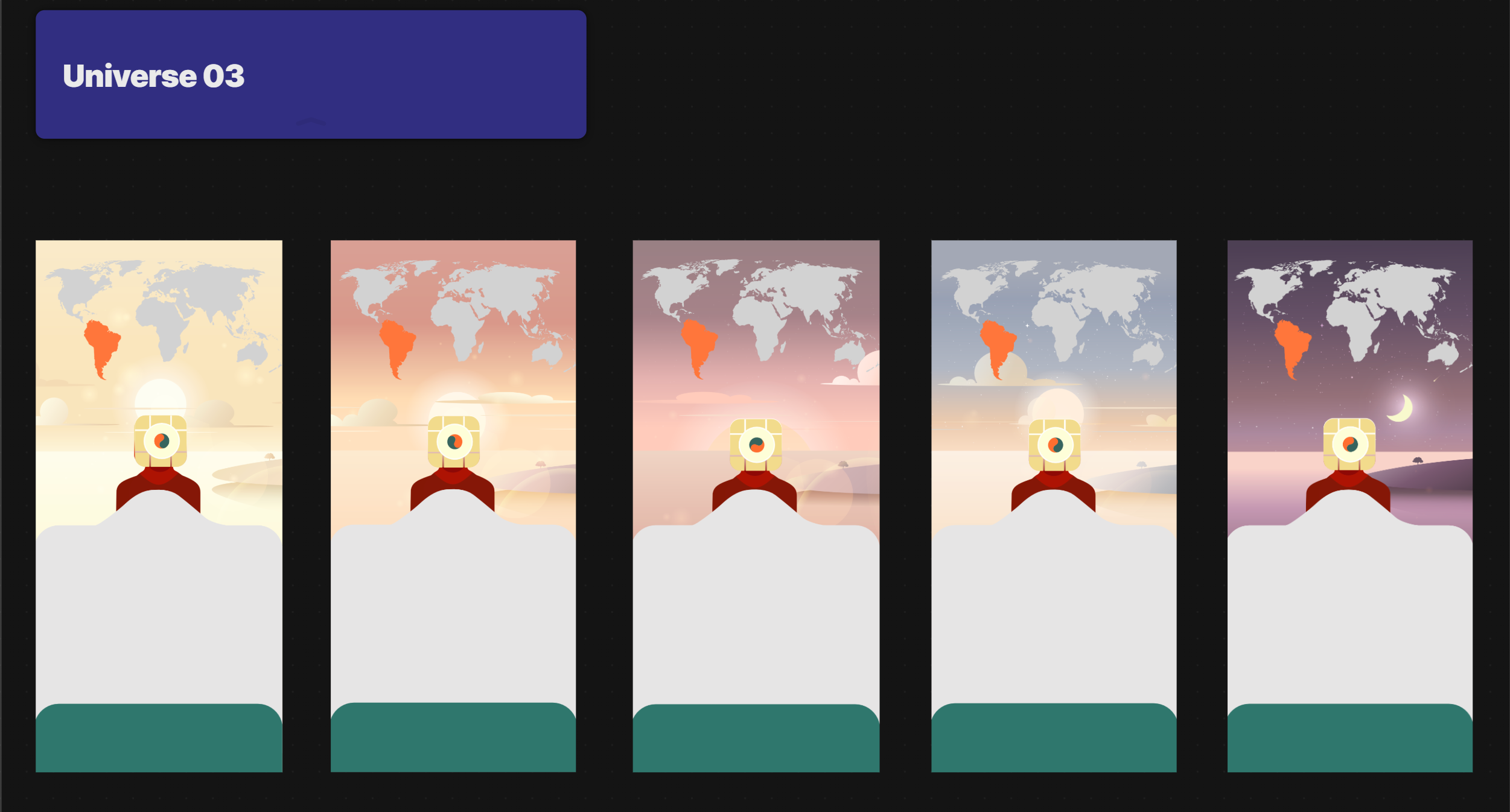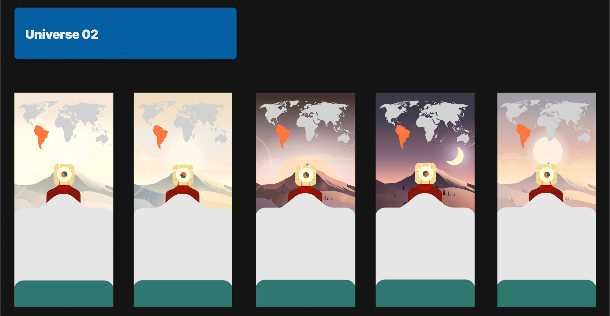One of the main design and animation challenges I faced wasn’t creating the parallax effect itself, but figuring out how to organize smooth transitions between two parameters for each universe: the time of day and the universe changes.