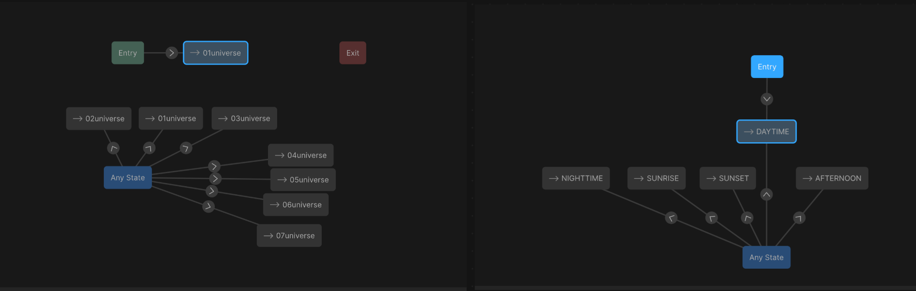 I tested different state machines, and to fix the universe transition I tried adding another layer with in/out animations for each universe, where the layers would move in and out. This approach worked when triggering either a universe change or a time-of-day change. At this stage, the transition looked better and felt smoother, but it still wasn’t perfect: